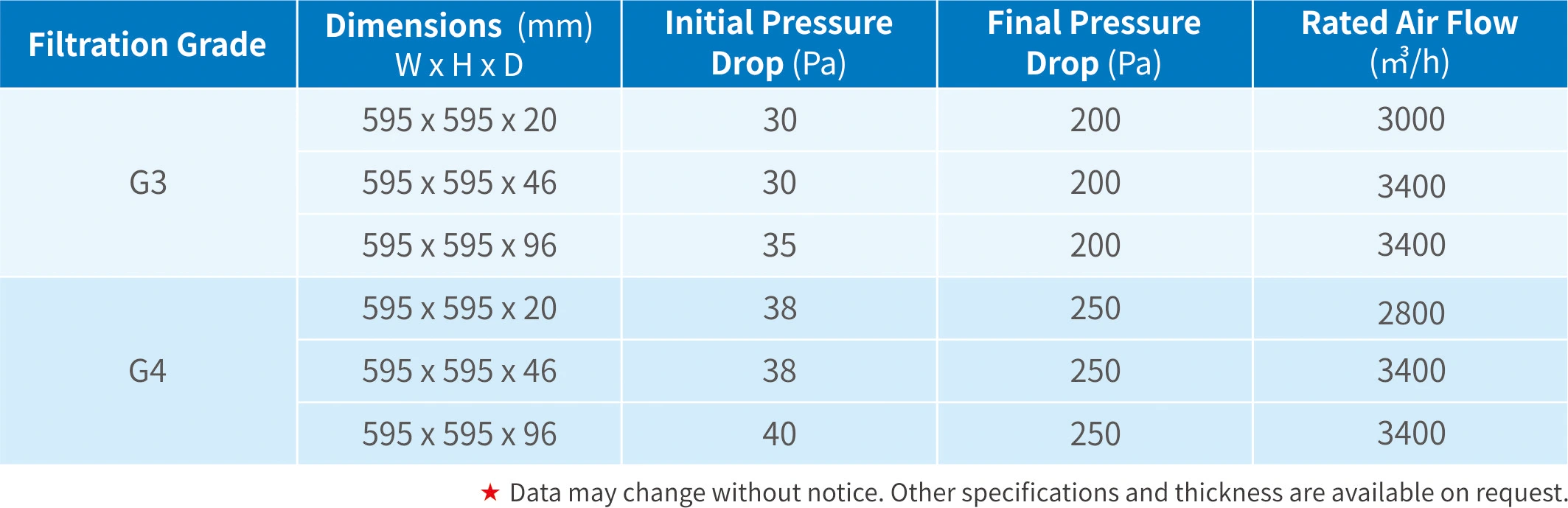 - Grade: G3, G4; MERV5, MERV6, MERV7, MERV8