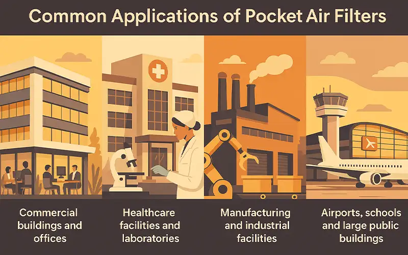 Pocket air filters are widely used in office buildings, retail centers, and other commercial spaces to maintain a clean and healthy indoor environment.