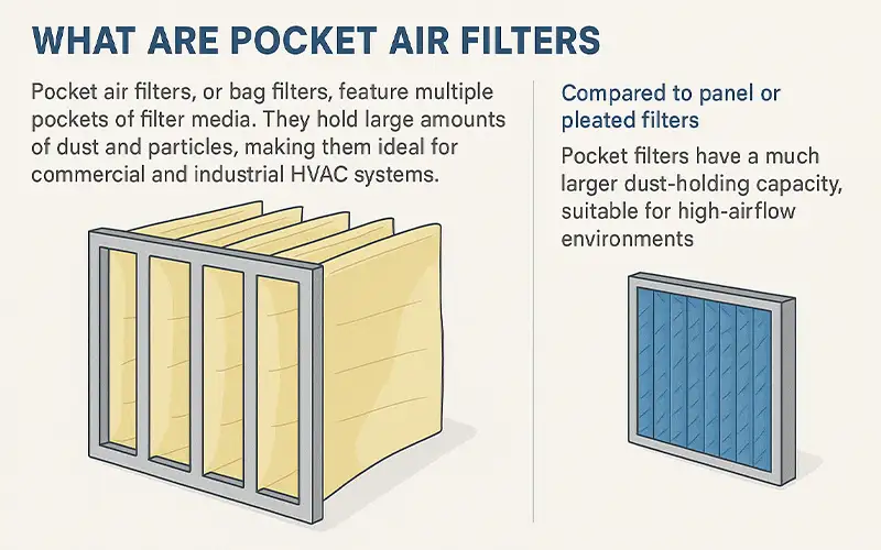 Pocket air filters are a type of high-capacity HVAC filter designed with multiple pockets or bag-like sections that expand the surface area of the filter media.